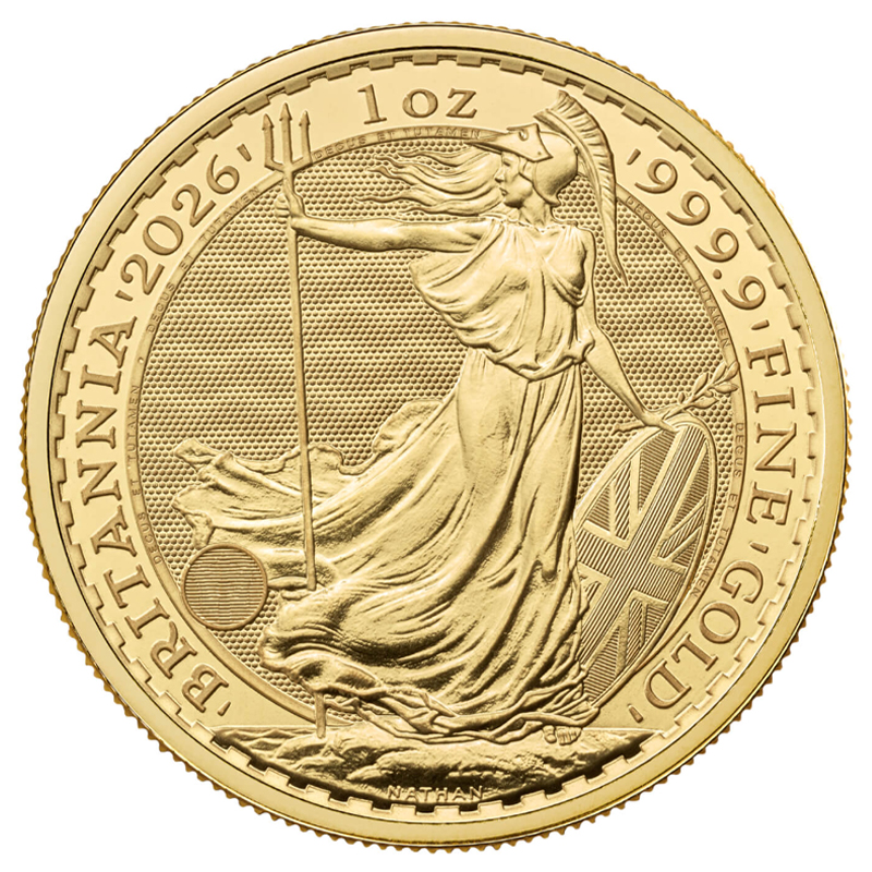 The 2026 Britannia 1oz Gold Coin is an official British bullion coin produced by The Royal Mint. Struck from 99.99% pure gold (24 carat), the coin weighs 31.21 grams and contains 31.10348 grams of fine gold, with a diameter of 32.69mm. It carries a £100 face value and is recognised as legal tender in the UK.