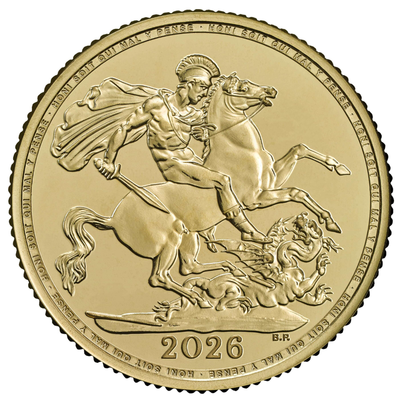 Benedetto Pistrucci’s iconic depiction of St George slaying the dragon once again features on the reverse, which is enhanced with micro-text for additional security. The obverse also incorporates advanced security features, including a new secure pattern and a latent image positioned just beneath the official coinage portrait of His Majesty King Charles III.